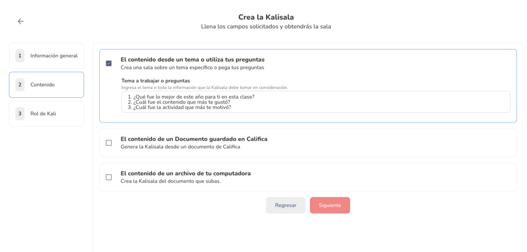 - haz click en “siguiente”. En la próxima parte, debes elegir “El contenido desde un tema o utiliza tus preguntas”. Marca la casilla y justo abajo, escribe las tres preguntas.